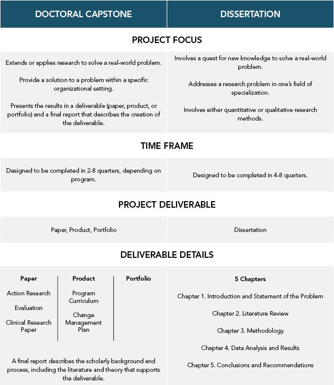 - A doctoral capstone is intended to extend or apply research to immediately deliver a solution to an issue within a real world setting. That’s why, unlike the dissertation, the doctoral capstone deliverable can take on so many different forms. It may be the writing of software to solve a specific technical problem, or a curriculum designed to solve a specific educational problem.