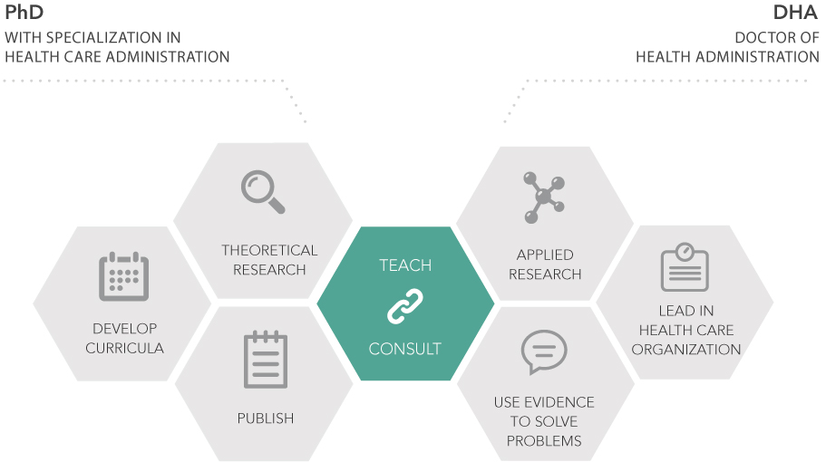 A DHA focuses on applying the best available evidence to solve problems in the field. This is often referred to as applied research. DHA graduates typically seek careers as administrative leaders in health care organizations.