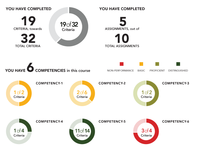 The competency map is automatically updated as assignments are evaluated, providing an instant snapshot of overall progress. This kind of visualization can provide significant motivation as students move closer to the completion of their degree.